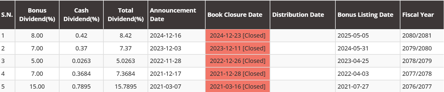 The 95th board of directors meeting held on Kartik 28 has decided to distribute 9% bonus shares and 0.47% cash dividend (for tax purposes) from the paid-up capital. Since the company's paid-up capital is Rs. 38.81 crore, the bonus shares are worth Rs. 3.49 crores, and the cash dividend is worth Rs. 18.38 lakhs.