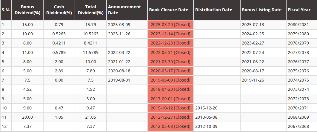 The meeting of the board of directors held on Poush 03 has decided to distribute 6.3158% cash dividend (including the amount for tax purposes) from the paid-up capital. The paid-up capital of the company is Rs. 2.54 Arba. Thus, the cash dividend is worth Rs. 16.09 Crores for tax purposes.