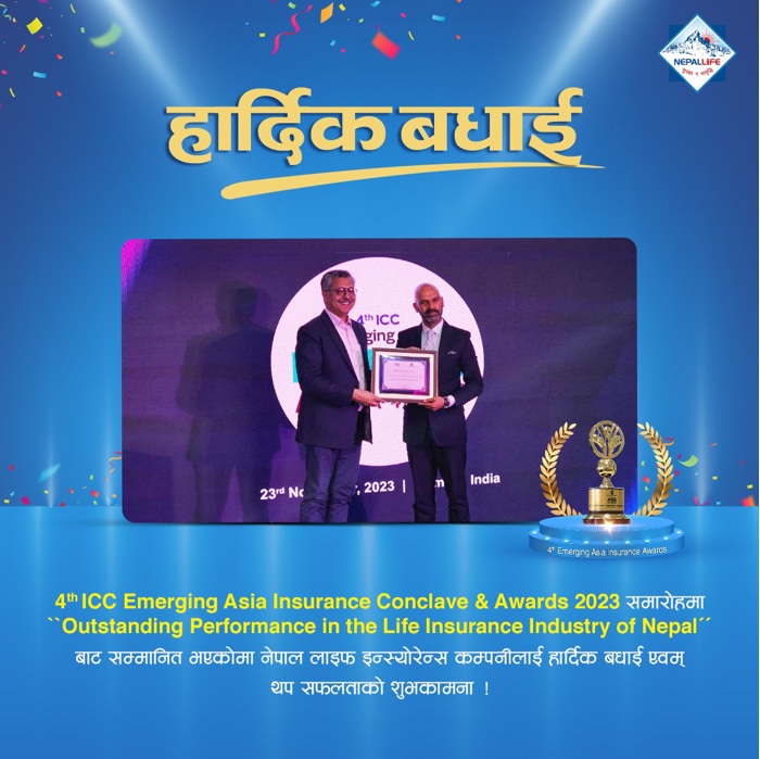 Nepal Life Insurance Company has received Outstanding Performance in the Life Insurance Industry of Nepal award at 4th ICC Emerging Asia Insurance Conclave and Award held at Mumbai of India organized by Indian Chamber of Commerce.