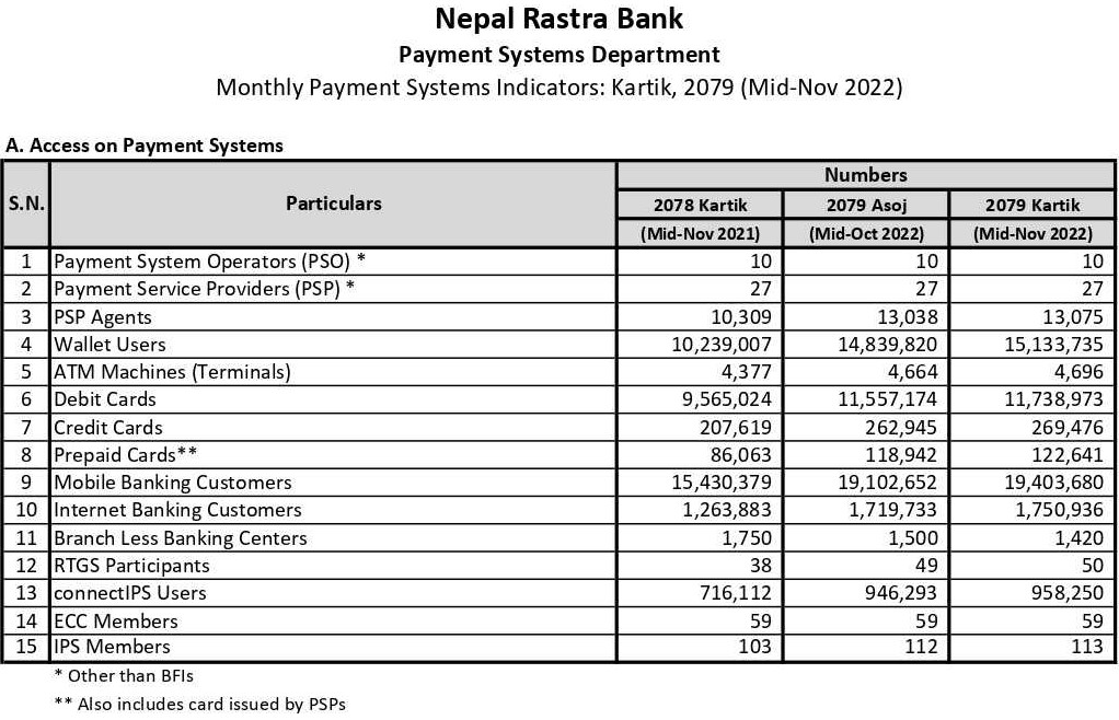In this article, we will analyze the Nepal Rastra Bank (NRB)'s monthly Payment Index which tracks the expansion of primarily digital payment methods in Nepal. Kartik 2079 and 2078 are used as comparison points (Y-O-Y Basis).