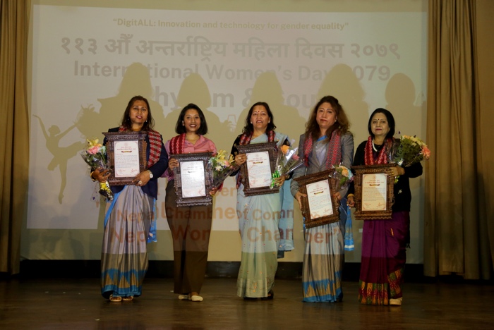 Nepal Women's Chamber has felicitated scores of female entrepreneurs amid the 113th international women’s day.