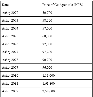 As per the above table gold price was Rs. 50,700 per tola during Ashoj 2072 and it surged to Rs. 2,58,000 per tola in Ashoj 2082. It indicates that there is an increment of 408.87% in the duration of 10 years.