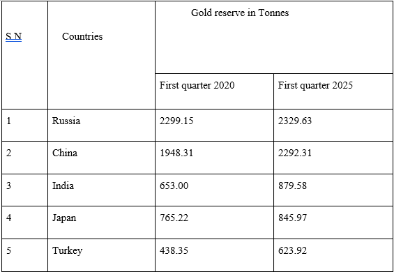 The data for gold reserves as compared between Q1 2020 and Q1 of 2025 is shown below: