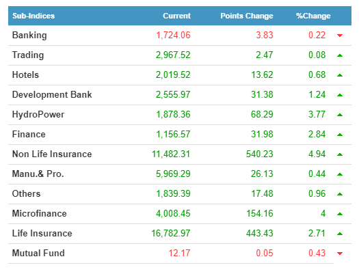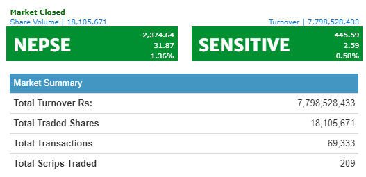 The NEPSE index gained 31.87 points today and closed at 2,374.64. This is the highest closing-ever in the history of NEPSE. The index has been breaking records and creating new highs for a long, and there seems to be no stopping.