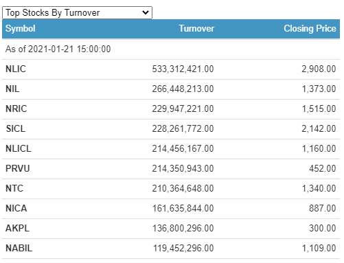 Nepal Life Insurance Company Limited (NLIC) has the highest individual scrip turnover of a little over Rs. 53.33 crores. The units of Siddhartha Investment Growth Scheme-2 (SIGS2) traded the most.