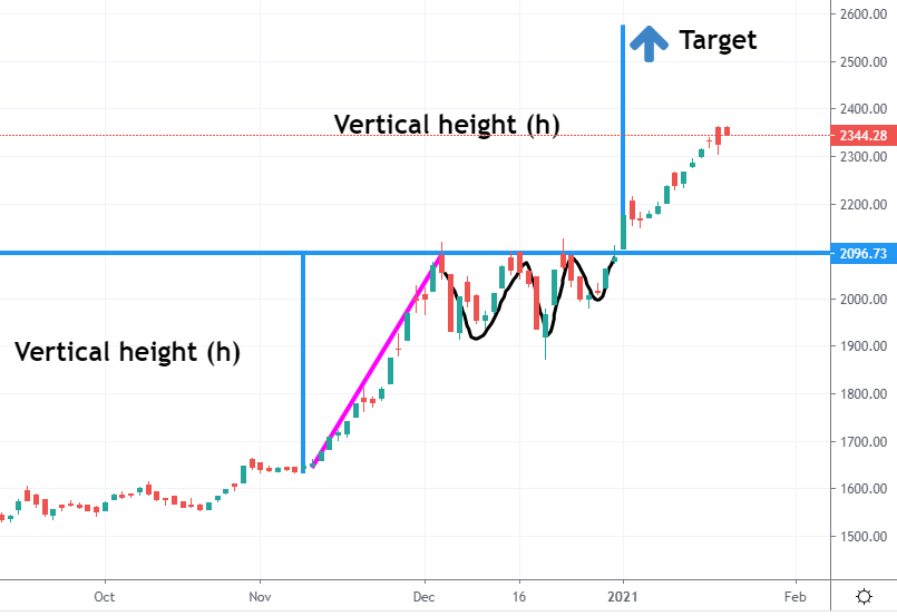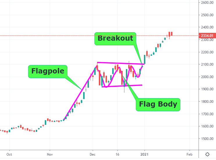 In technical analysis literature, it is generally believed that the vertical height of the flagpole is the minimum vertical gain the stock/ index will have from the point of breakout. Thus, if the index crosses the resistance drawn by the Fibonacci retracement chart, perhaps the tip of the vertical scale is the next target.