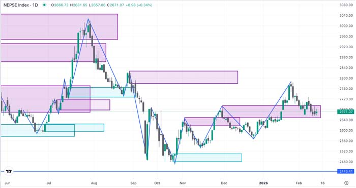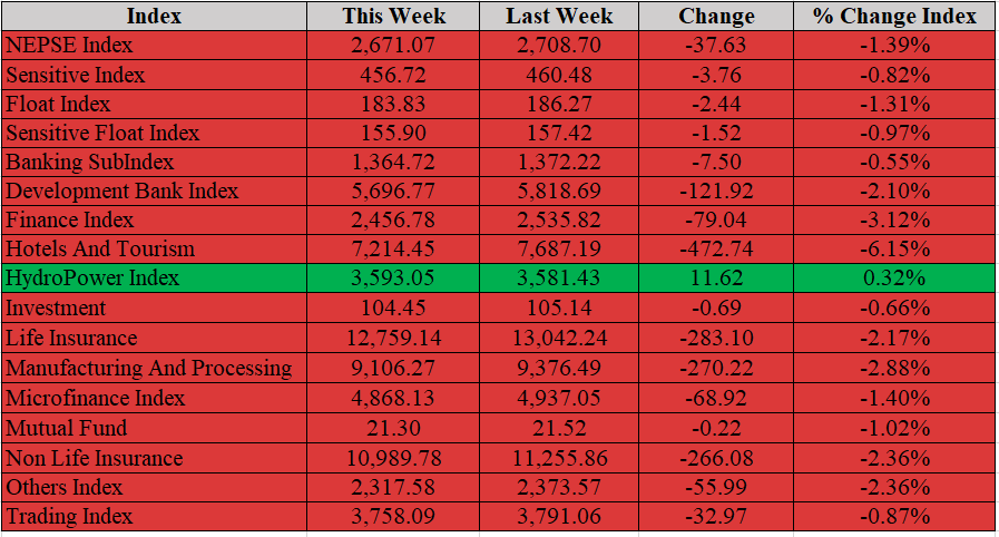The NEPSE Index closed at 2,671.07, down 37.63 points (1.39%). The index closed at 2,708.70 last week, down 0.20% from the previous week.