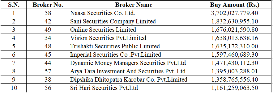 This week, Naasa Securities Co. Ltd. (Broker No. 58) was the top buying broker and purchased stocks worth Rs. 3.70 Arba.
