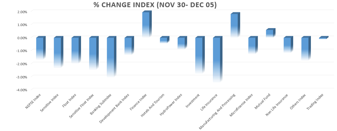 The NEPSE index decreased by 1.68% this week. Only three sector indices are closed in the green.