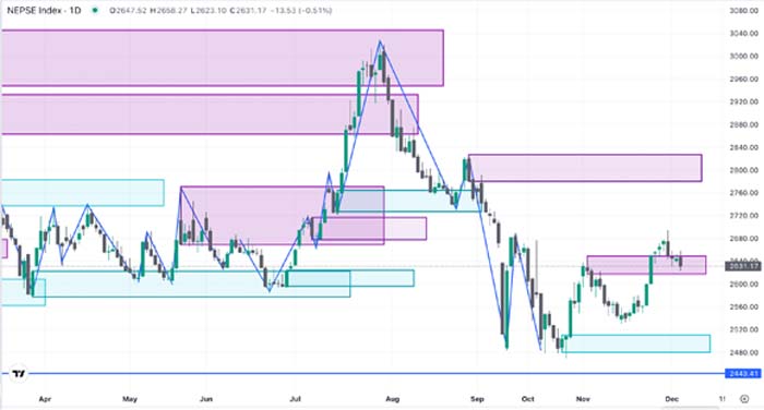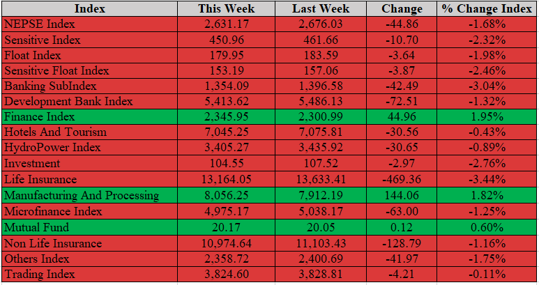 The NEPSE Index closed at 2,631.17, down 44.86 points (1.68%). The index closed at 2,676.03 last week, up 4.52 % from the previous week.