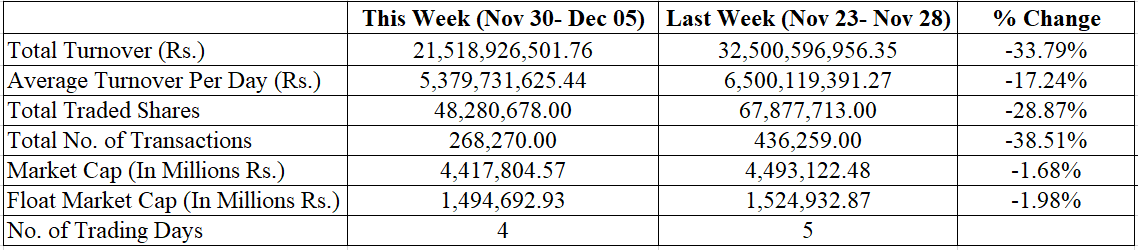 The highest intraday loss was 26.51 points on Sunday, with a turnover of Rs 7.08 Arba; however, the total turnover for the week stood at Rs 21.51 Arba.