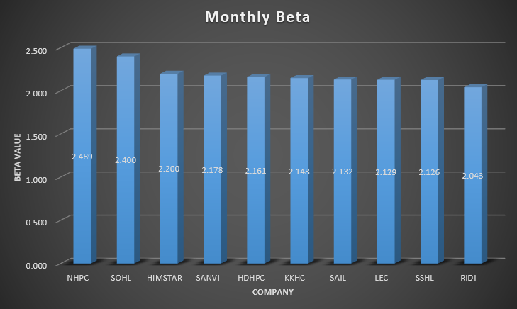 The top three companies with the highest beta are National Hydro Power Company Limited (NHPC), Solu Hydropower Limited (SOHL), and Him Star Urja Company Limited (HIMSTAR) with betas of 2.489, 2.400, and 2.200, respectively.