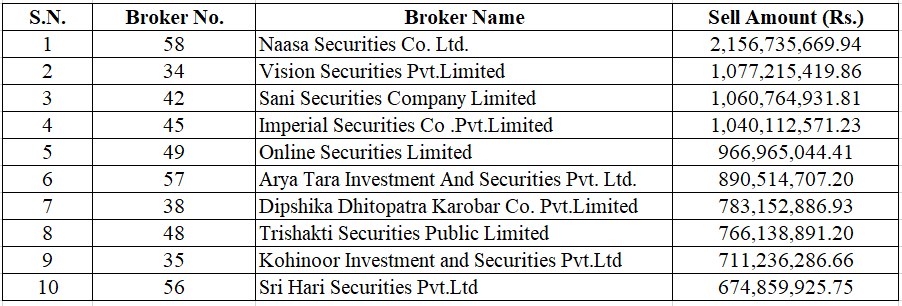 Naasa Securities Co. Limited (Broker No.- 58) was the top seller broker for this week. The brokerage firm has sold stocks worth Rs. 2.15 Arba.
