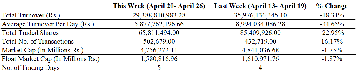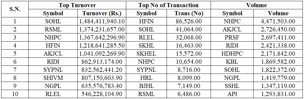 The highest intraday loss was 18.10 points on Tuesday, with a turnover of Rs 5.77 Arba; however, the total turnover for the week stood at Rs 29.38 Arba. Over 6.58 Crore unit shares have been traded through 5,02,679 transactions this week. The current market capitalization of NEPSE is Rs. 4,756,272.11 million, i.e., Rs 47.56 Kharba.