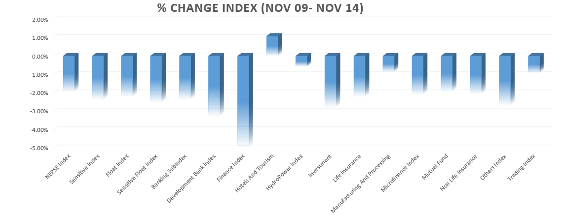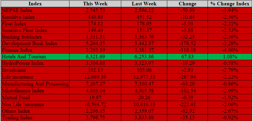 The NEPSE index decreased by 1.94% this week. Only one Sector index is closed in the green.