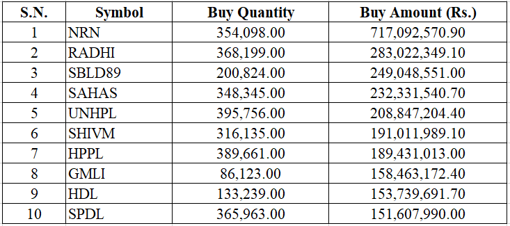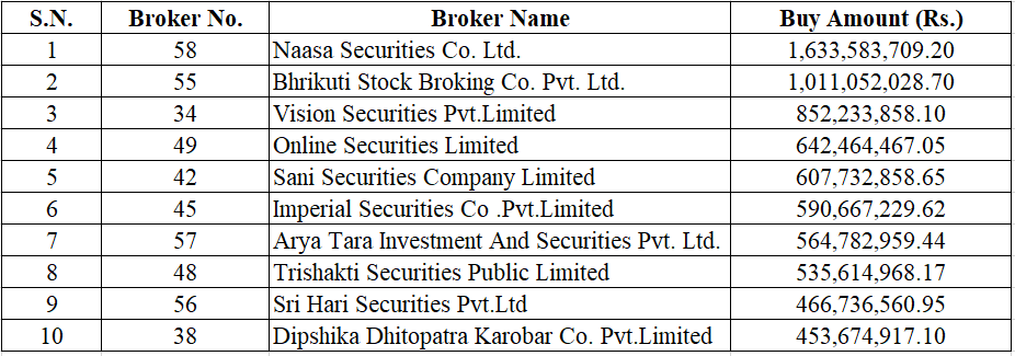 This week, Naasa Securities Co. Ltd. (Broker No.- 58) was the top buyer broker and bought stocks worth Rs. 1.63 Arba.