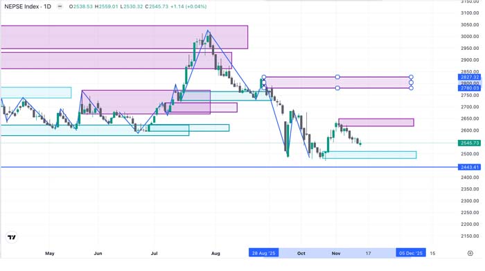 The NEPSE Index closed at 2,545.73 after losing 50.39 points (1.94%). The index closed at 2,596.12 last week, down 0.16 % from the previous week.