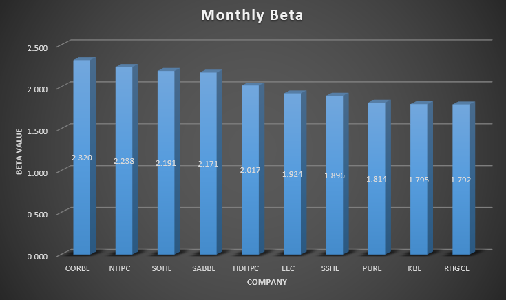 The top three companies with the highest beta are Corporate Development Bank (CORBL), National Hydro Power Company Limited (NHPC), and Solu Hydropower Limited (SOHL), with betas of 2.320, 2.238, and 2.191, respectively.