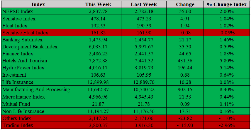 The market traded for six days this week. The NEPSE Index closed at 2,837.78, up 55.60 points (2%). The index closed at 2,782.16 last week, down 5.69% from the previous week.