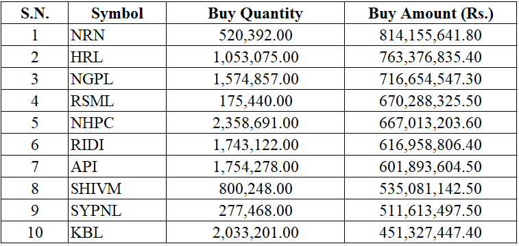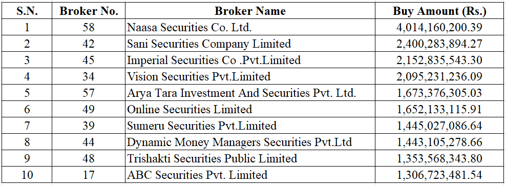 This week, Naasa Securities Co. Ltd. (Broker No. 58) was the top buying broker and purchased stocks worth Rs. 4.01 Arba.