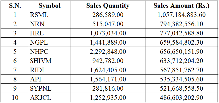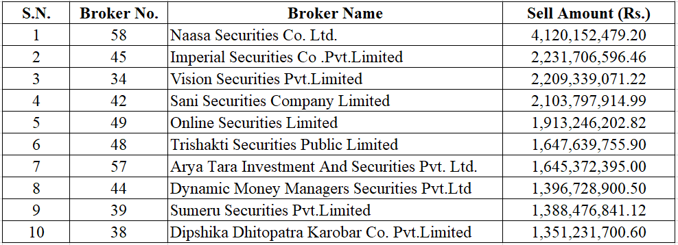 Naasa Securities Co. Limited (Broker No.- 58) was the top seller broker for this week. The brokerage firm has sold stocks worth Rs. 4.12 Arba.