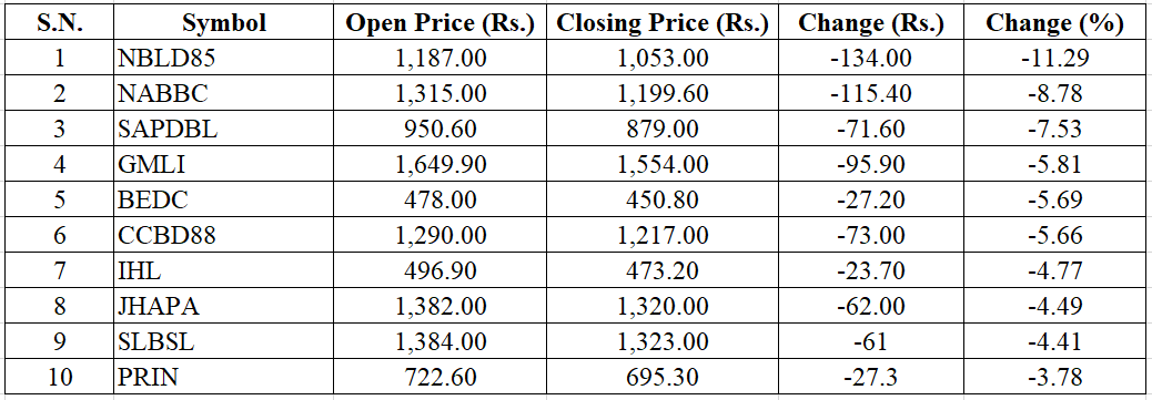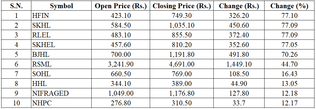 Hotel Forest Inn Limited (HFIN) is the top gainer. HFIN closed at Rs. 749.30 with an increase of Rs. 326.20 (77.10%).