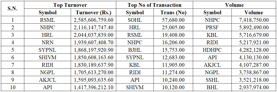 The highest intraday gain was 83.34 points on Monday, with a turnover of Rs 10.92 Arba; however, the total turnover for the week stood at Rs 57.27 Arba. Over 14.16 Crore unit shares have been traded through 6,51,222 transactions this week. The current market capitalization of NEPSE is Rs. 4,824,532.17 million, i.e., Rs 48.24 Kharba.