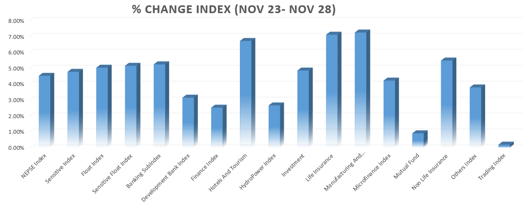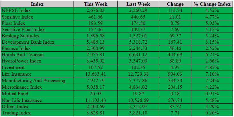 The NEPSE index increased by 4.52% this week. All sector indices are closed in the green.