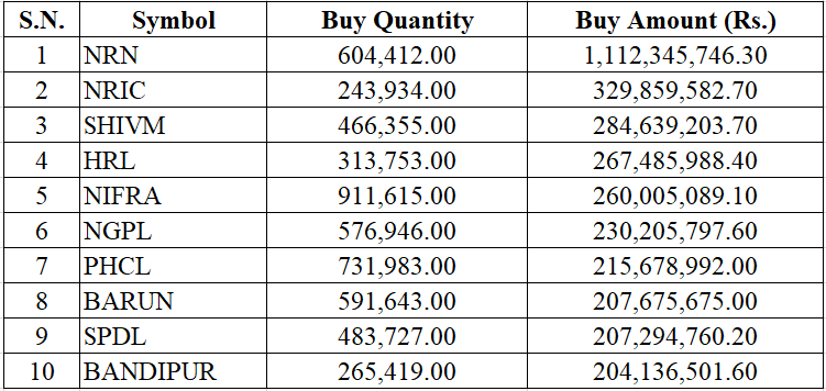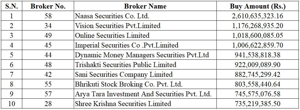 This week, Naasa Securities Co. Ltd. (Broker No. 58) was the top buying broker and purchased stocks worth Rs. 2.61 Arba.