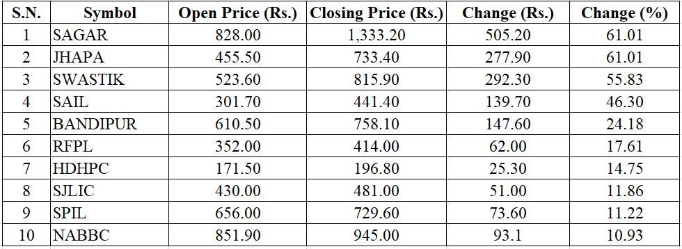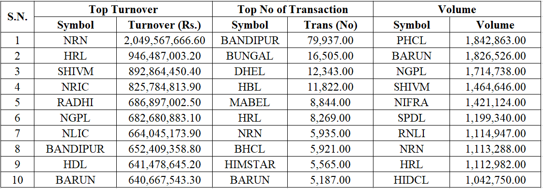 The highest intraday gain was 50.44 points on Monday, with a turnover of Rs 7.03 Arba; however, the total turnover for the week stood at Rs 32.50 Arba. Over 6.78 Crore unit shares have been traded through 4,36,259 transactions this week. The current market capitalization of NEPSE is Rs. 4,493,122.48 million, i.e., Rs 44.93 Kharba.