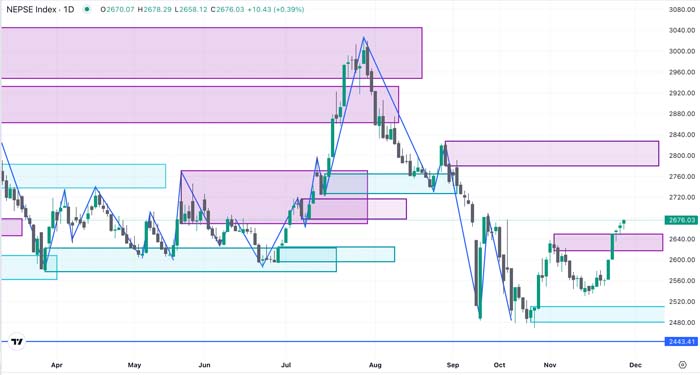 The NEPSE Index closed at 2,676.03 after gaining 115.74 points (4.52%). The index closed at 2,560.29 last week, up 0.57 % from the previous week.