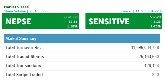 The NEPSE index gained 32.81 points today and closed at 2,820.00. The index opened at 2,768.86 and immediately made the intraday low at 2,738.70. However, the index gained in intraday action today, closing at the intraday high of 2,820. This is also the highest index-closing in the history of NEPSE.