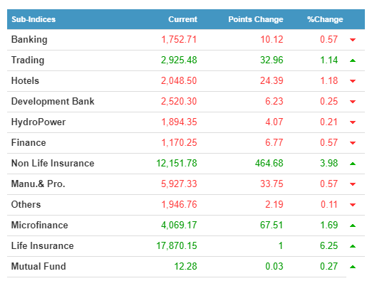 Five sectors gained and seven others closed red. While the Life Insurance sector gained a massive 6.25%, Hotels lost the most 1.18%.