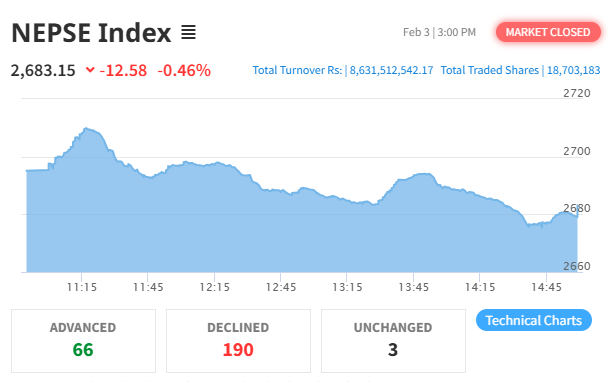 The Nepal Stock Exchange (NEPSE) recorded a loss today, losing by 12.58 points (0.46%) to settle at 2,683.15. This follows a 1.53 point gain in the previous session.