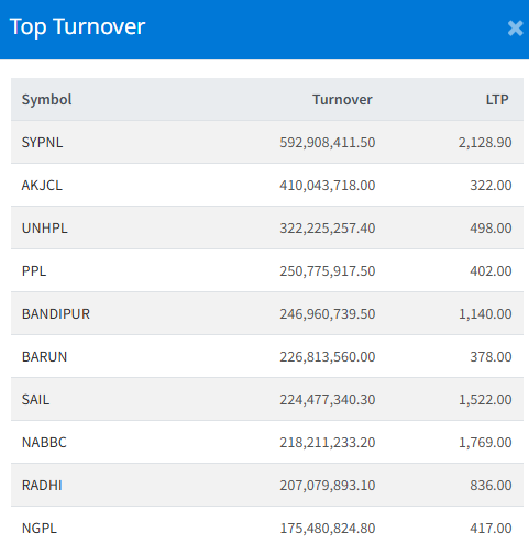 SY Panel Nepal Limited (SYPNL) topped the turnover chart, amounting to Rs. 59.29 crores. The stock closed at Rs. 2,128.90.