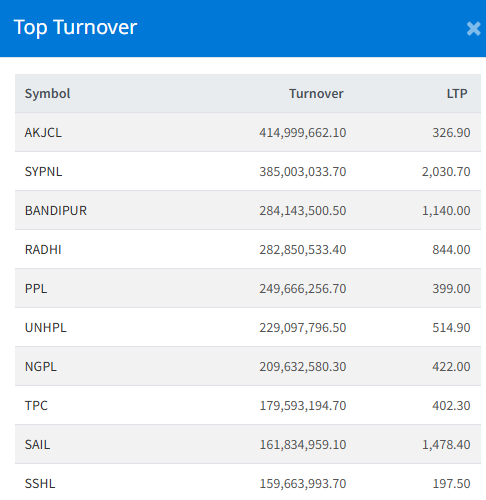 Ankhu Khola Jalvidhyut Company Ltd (AKJCL) topped the turnover chart, amounting to Rs. 41.49 crores. The stock closed at Rs. 326.90.