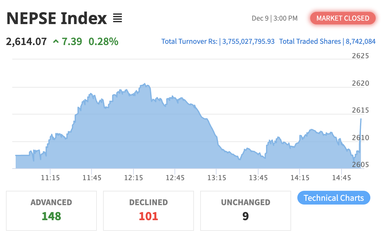 NEPSE Edges Up to 2,614.07 with Rs. 3.75 Arba Turnover; NGPL Tops Turnover Chart