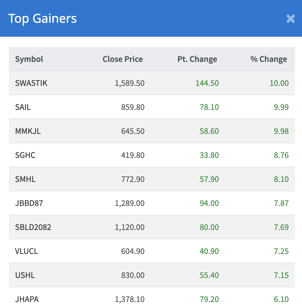 Swastik Laghubitta Bittiya Sanstha Limited (SWASTIK) and Shreenagar Agritech Industries Limited led the gainers' list by 10.00% each.