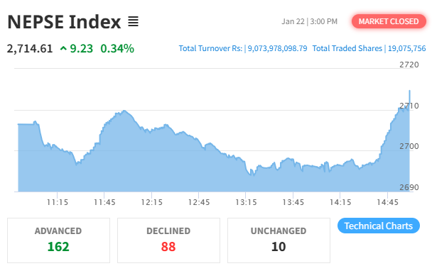 The Nepal Stock Exchange (NEPSE) recorded a gain today, gaining by 9.23 points (0.34%) to settle at 2,714.61. This follows a 9.43 point loss the previous session.