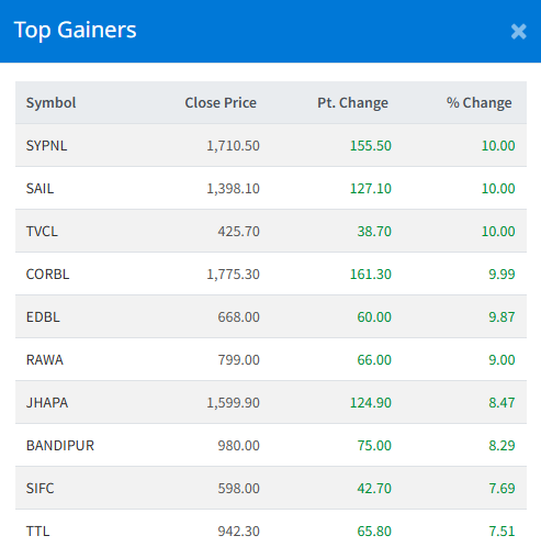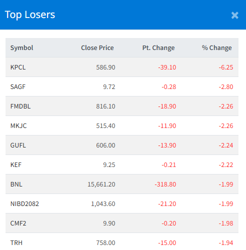 Meanwhile, Kalika power Company Ltd (KPCL) recorded the steepest drop, falling 6.25%.