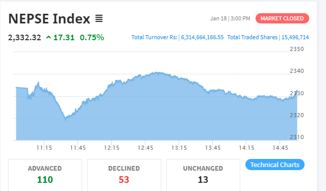 The NEPSE index gained 17.31 points today and closed at 2,332.32. This is the highest closing ever in the history of NEPSE. The record was broken just on the last trading session. The index has been creating newer highs since long.