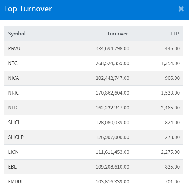 Prabhu Bank Limited (PRVU) has the highest individual scrip turnover of a little over Rs. 33.46 crores. Its shares also traded the most today.