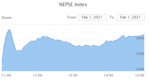 The NEPSE index gained 37.7 points today and closed at 2,408.24. This is a 1.59% gain from yesterday's closing.