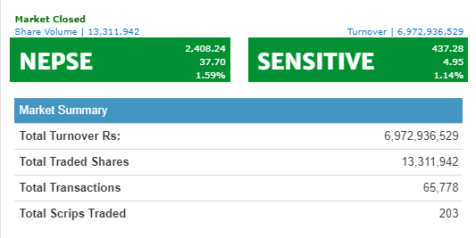 NEPSE Gains 37.7 Points and Closes at 2,408.24; Total Turnover at Rs. 6.97 Arba