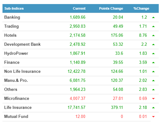 Microfinance and Mutual Funds lost, with Microfinance losing the most between them. Among all other sectors that gained, Hotels gained a massive 8.76%.