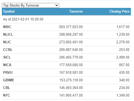 Nepal Reinsurance Company Limited (NRIC) has the highest individual scrip turnover of a little over Rs. 58.33 crores. The shares of Century Commercial Bank Limited (CCBL) traded the most.