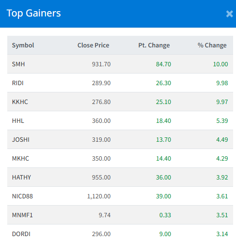 Super Mai Hydropower Limited (SMH) led the gainers list with 10.00% each.