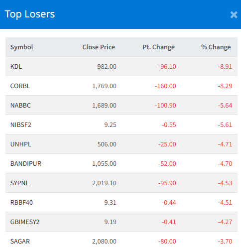 Meanwhile, Kalinchowk Darshan Limited (KDL) recorded the steepest drop, falling 8.91%.