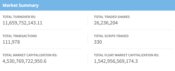 The benchmark index opened at 2712.34, touching an intraday high of 2,728.43, while the lowest point was 2,695.20. Total turnover for the day reached Rs. 11.65 Arba, with 26,236,204 shares traded across 330 companies through 111,978 transactions. Market capitalization stood at Rs. 45.30 Kharba, with a float market capitalization of Rs. 15.42 Kharba.