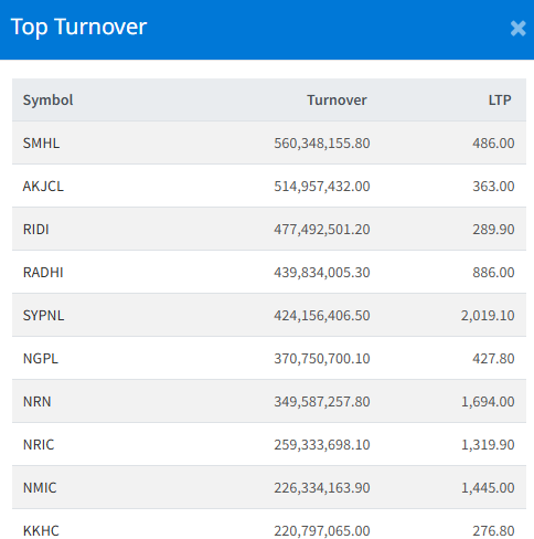 Super Madi Hydropower Limited (SMHL) topped the turnover chart, amounting to Rs. 56.03 crores. The stock closed at Rs. 486.00.
